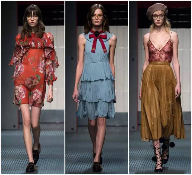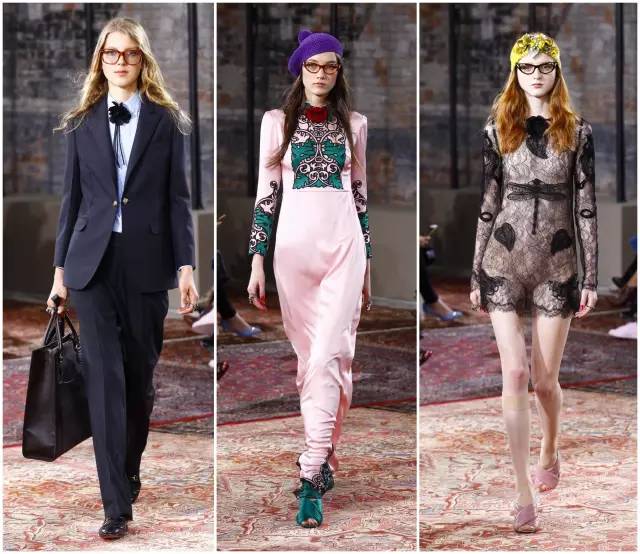 上半身是清教徒学霸式一丝不苟的发髻与刻板无趣的眼镜,下半身已是春色无边的波西米亚式"浪荡"印花与裙边,或是一览无余的薄纱蕾丝。将一切打破、重组、再打破,就是Alessandro Michele的立新之道。