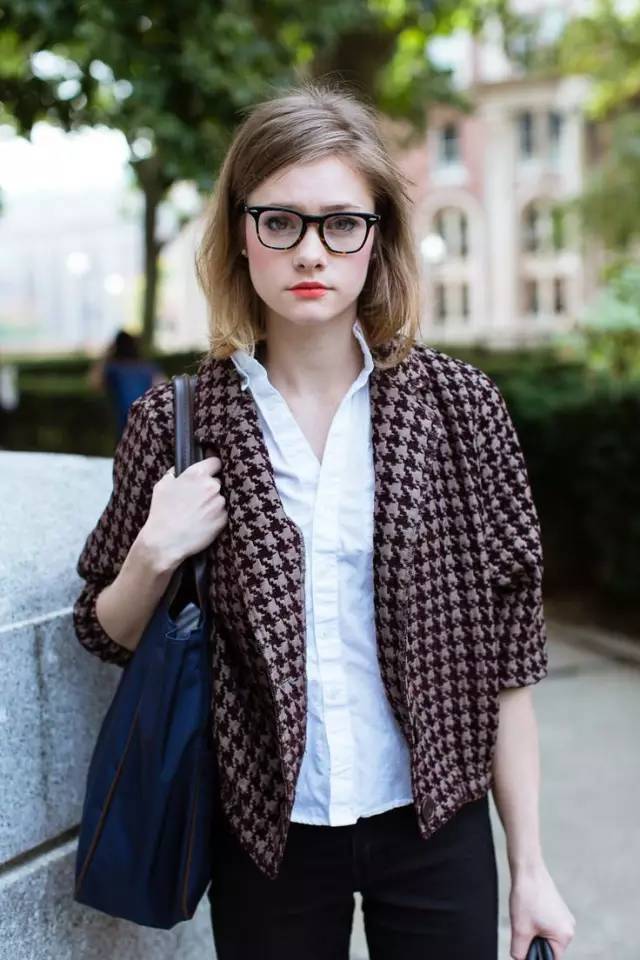 时装精们用眼镜打造的风格总体分成两大派,一个是由T台延伸下来的60/70年代复古风格,少了秀场上夸张的那部分,格纹、衬衫、呢子外套加上眼镜,浓浓的学院风扑面而来,结合妆容和其他一些配饰,可谓是整体造型中的点睛之笔。